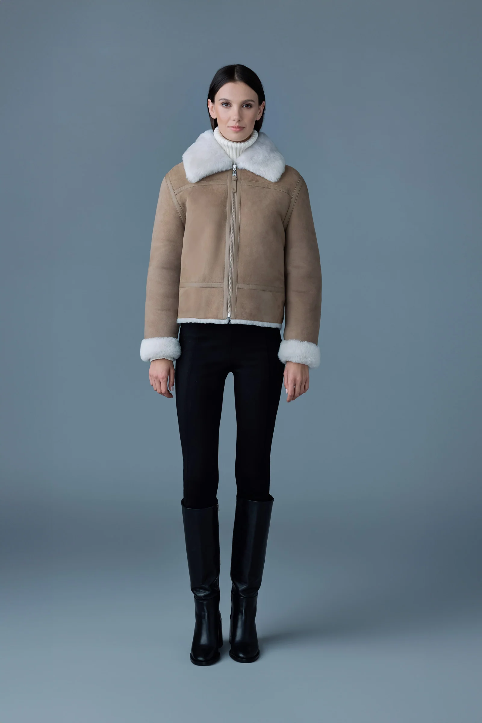 BETTY is a sheepskin jacket with 2-in-1 reversible styling. Cut to a regular fit, one side features lush shearling fur while the reverse shows paneled leather. Versatile styling in a trans-seasonal piece.