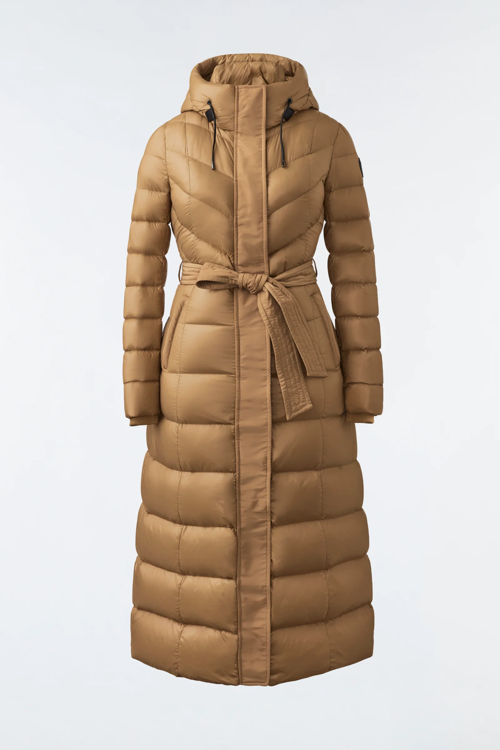 CALINA is a longline coat for women crafted from recycled lustrous down. Flaunting a fitted A-line cut, the tonal sash belt and contrast chevron quilting enhance the statement silhouette. The adjustable storm visor hood, insulated pockets, and rib knit cuffs bring signature performance. Finished with a contrast storm placket for added protection.