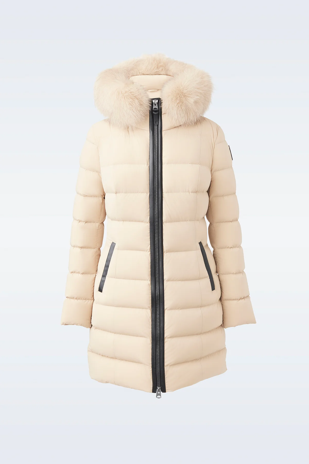 CALLA is a light down coat for women cut from our proprietary Agile 360 stretch shell with a removeable blue fox fur trim around the hood. It is meticulously tailored to a fitted silhouette to maximize comfort and ease of movement. Water resistant and repellent, it features an adjustable drawcord hood and insulated pockets. An elegant and versatile piece for elevated styling.