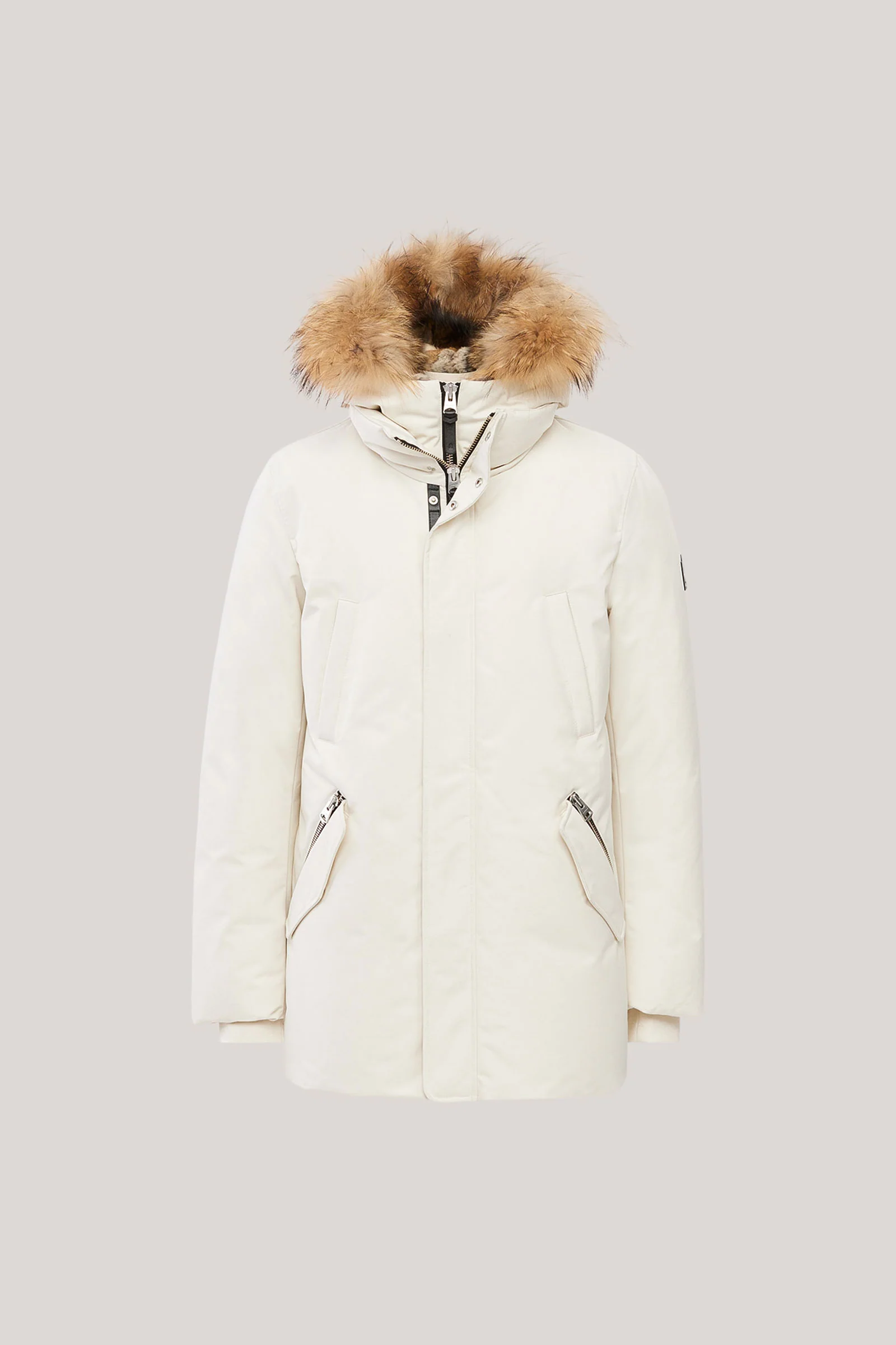 EDWARD-F is a Nordic Tech recycled down parka with a removable hooded bib and natural fur collar. Engineered for warmth in the coldest temps, it is windproof, water resistant and repellent, and breathable. The storm placket, hidden waist drawcord, and insulated pockets deliver extra performance. Dual-entry waist pockets and welt chest pockets add multifunction. Contrast leather detailing and a sleeve logo patch complete the look. A deep winter essential with timeless lines.