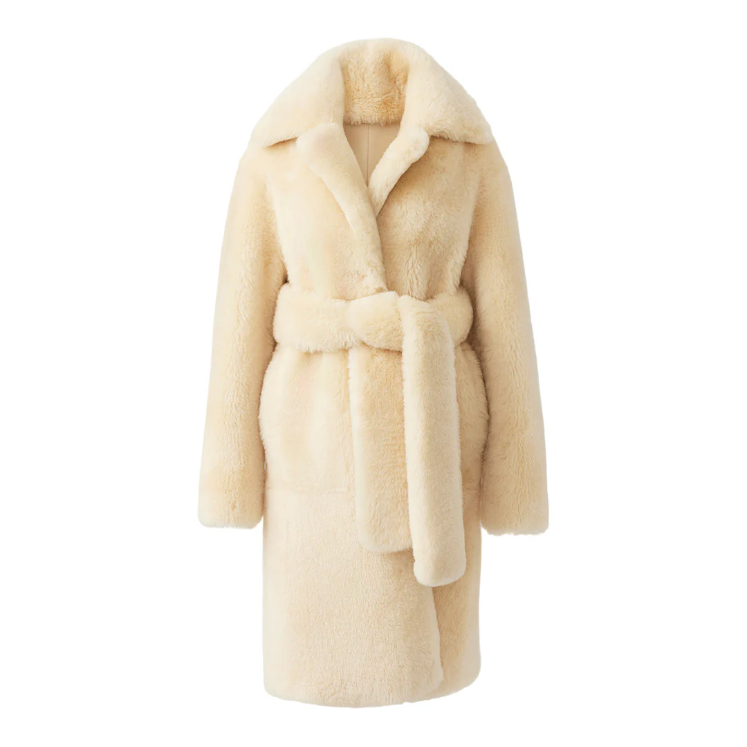 ETIENNE is a reversible double-breasted coat for women crafted from incredibly soft shearling. The peaked lapel, dropped shoulders, and sash belt bring dimensionality to the relaxed silhouette. A cozy and striking sartorial solution to cold weather.