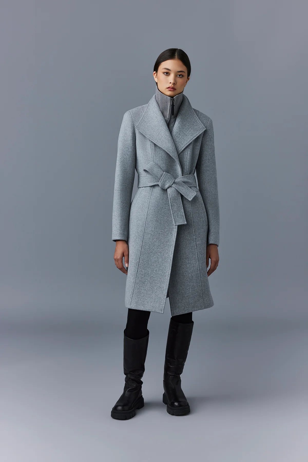 NORITA is a 2-in-1 women's coat featuring a removable rib knit bib for multi-seasonal use. Made from double-face wool, a sash belt accentuates the tailored fitted cut and asymmetrical front zip closure. The oversized double collar with winged edges provides eye-catching modern appeal. A versatile yet luxe layer for any setting or climate.