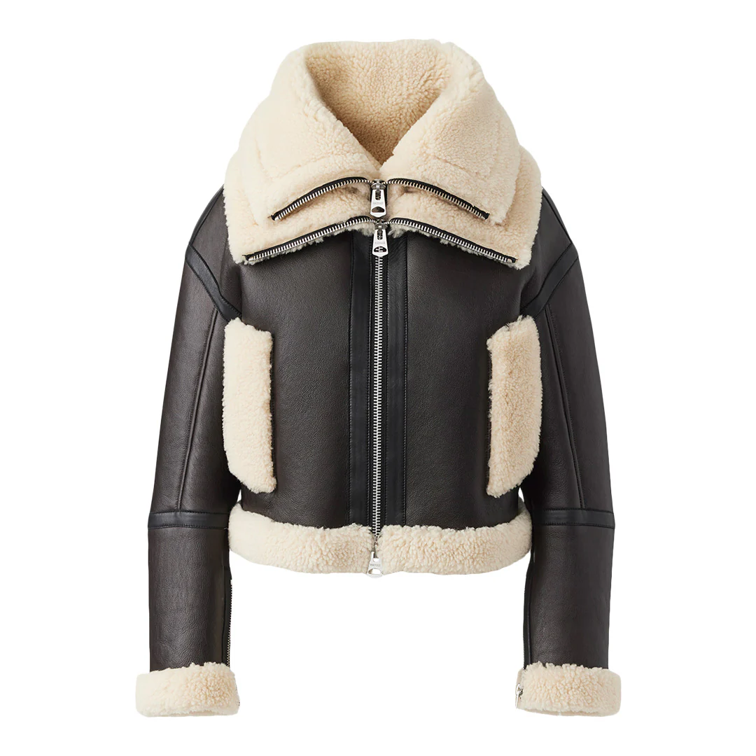 PENELOPA is a luxurious sheepskin jacket for women featuring fine edge painting finishing throughout. Soft leather trim covers the jacket throughout providing a warm and comfortable layer for the cold days down to -20ºc. Dramatic double removable stand collars add a unique eye-catching detail while providing extra coverage for high winds. The oversized fit is complimented by articulated sleeves and dropped shoulders. Shearling welt pockets offer storage room for essentials. An inspired take on an enduring piece of men’s outerwear.