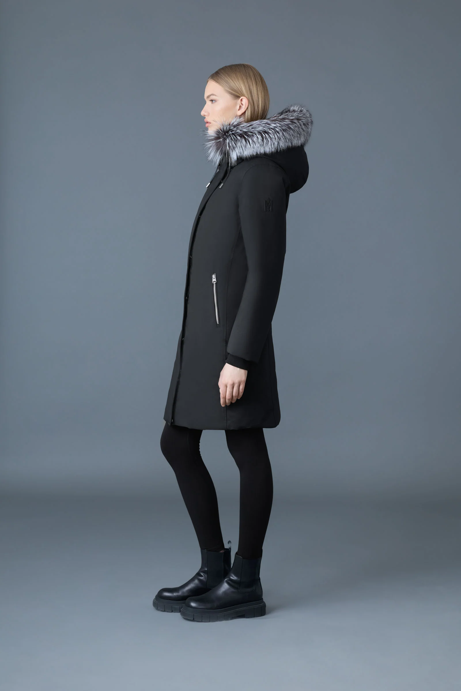 SHILOH-X is a 2-in-1 recycled down for women three-quarter with removable lustrous down bib and adjustable storm visor hood. Our proprietary Nordic Tech weave and removable silver fux fur trim deliver ultimate comfort in the coldest weather. The leather welt storm placket add custom warmth. Skillfully tailored for fashion-forward versatility.