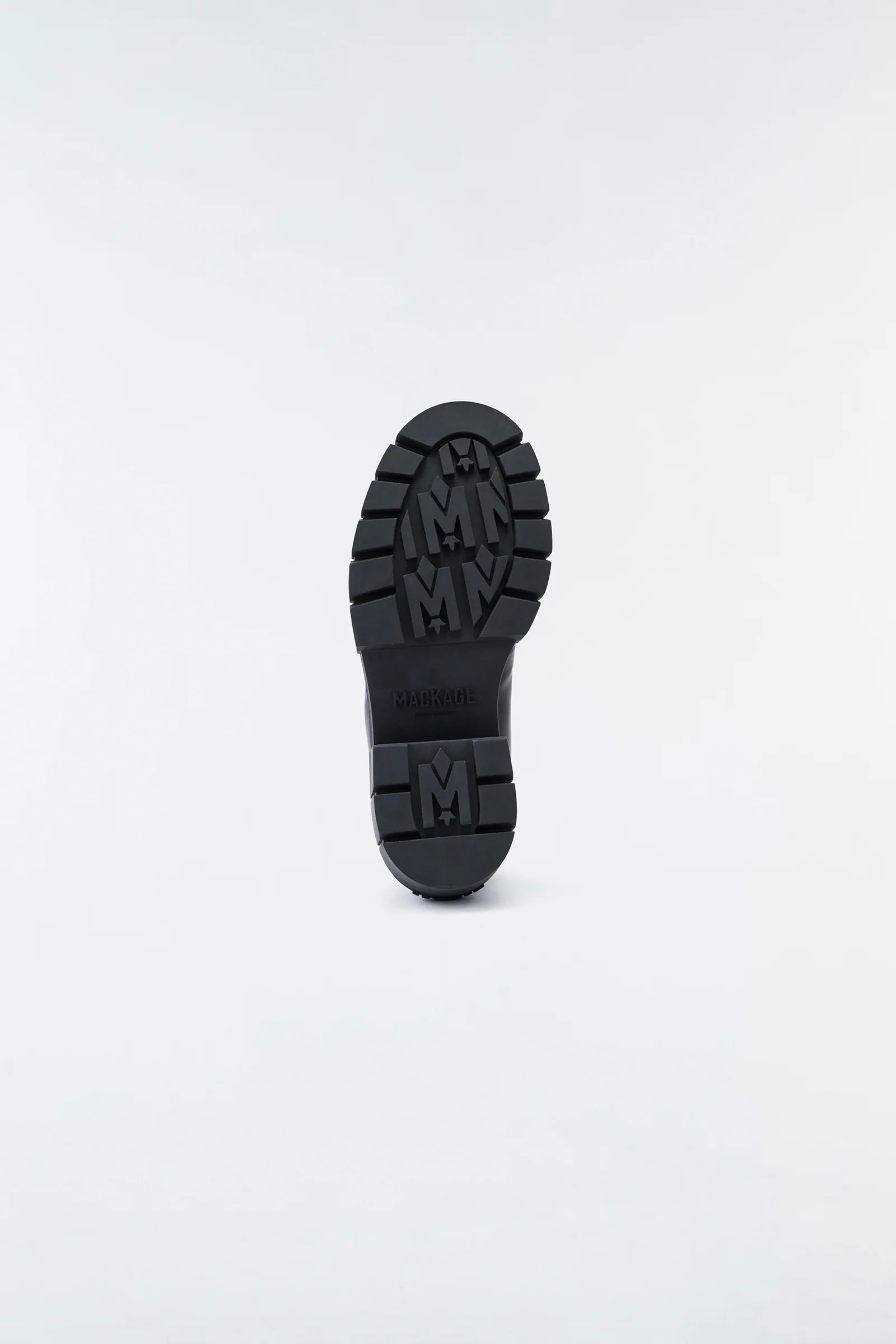 SUMMIT is a water resistant and repellent mid-heel lace-up leather ankle boot for women with shearling lining for extra warmth. An on-trend built-up rubber sole adds traction and edge. An elegant all-weather boot.