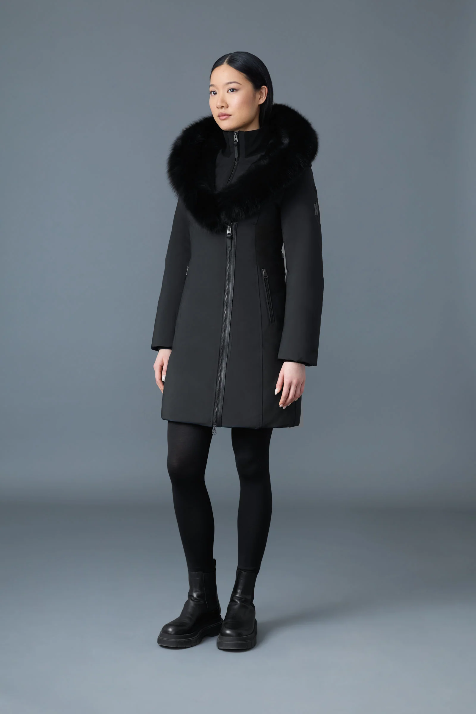 TRISH-BX is a Powder Touch down coat for women with a Signature Collar with blue fox fur and a windproof shell. Water resistant, repellent, and breathable, it is expertly tailored to a fitted silhouette and features a distinctive asymmetrical zip closure for avant-garde styling. Storm cuffs and an inner ribbed bib add extra warmth in extreme weather. A bold style statement with protective comfort.